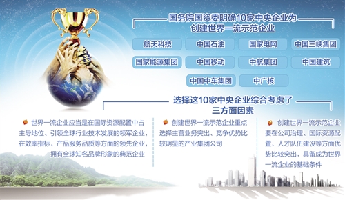 日前,國(guo)務院(yuan)國(guo)資委(wei)明確航天科(ke)技、中(zhong)(zhong)國(guo)石油、國(guo)家電網、中(zhong)(zhong)國(guo)三(san)峽(xia)集(ji)團、國(guo)家能源集(ji)團、中(zhong)(zhong)國(guo)移動、中(zhong)(zhong)航集(ji)團、中(zhong)(zhong)國(guo)建筑、中(zhong)(zhong)國(guo)中(zhong)(zhong)車集(ji)團、中(zhong)(zhong)廣(guang)核10家中(zhong)(zhong)央企業(ye)為創建世界一流(liu)示(shi)范企業(ye),將在(zai)未(wei)來(lai)3年左右(you)時間內有針對性地鋪(pu)開(kai)多領(ling)域綜合性改(gai)革舉措,重點探索培(pei)育具有全(quan)球競爭力(li)的(de)世界一流(liu)企業(ye)的(de)有效途徑。