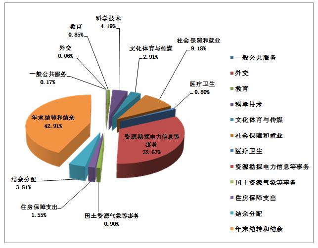 (9)國土資源氣象等事務(類)6813.01萬元,主要用于國資委所屬有關單位承擔的地質及礦產資源調查、礦產資源專項收入安排的支出等。2013年決算數較2012年決算數減少5402.92萬元,降低44.23%,主要原因是有關單位承擔的國家財政安排的地質調查和礦產資源項目減少。