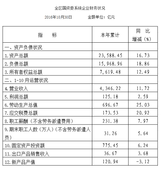 1.資(zi)產總(zong)額(e)情況。至2016年10月末,廣(guang)西國資(zi)委全(quan)系(xi)(xi)統國有企(qi)(qi)業(ye)(不包(bao)括信用社(she))資(zi)產總(zong)額(e)為23,588.45億(yi)(yi)元(yuan),同比(bi)增(zeng)長16.73%;其(qi)中,廣(guang)西國資(zi)委管理(li)國有企(qi)(qi)業(ye)(42戶(hu)企(qi)(qi)業(ye))資(zi)產總(zong)額(e)10,597.42億(yi)(yi)元(yuan),同比(bi)增(zeng)長13.69%。全(quan)系(xi)(xi)統國有企(qi)(qi)業(ye)中46戶(hu)企(qi)(qi)業(ye)資(zi)產總(zong)額(e)超100億(yi)(yi)元(yuan)、45戶(hu)企(qi)(qi)業(ye)資(zi)產總(zong)額(e)增(zeng)加額(e)超10億(yi)(yi)元(yuan)。