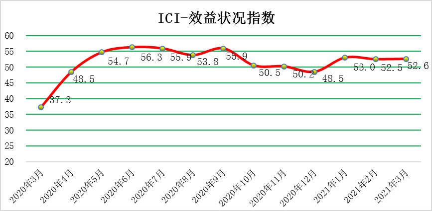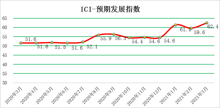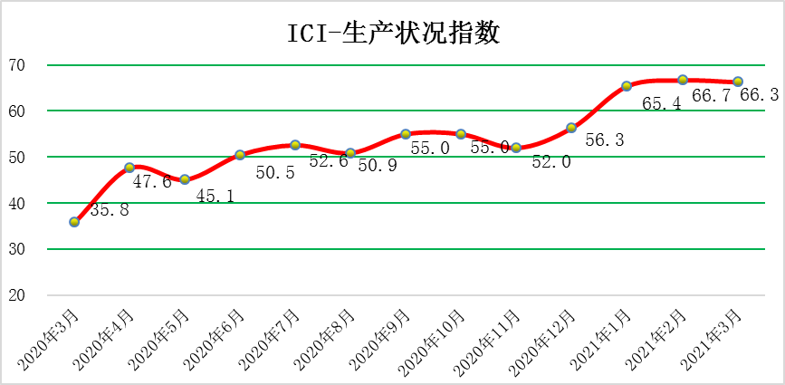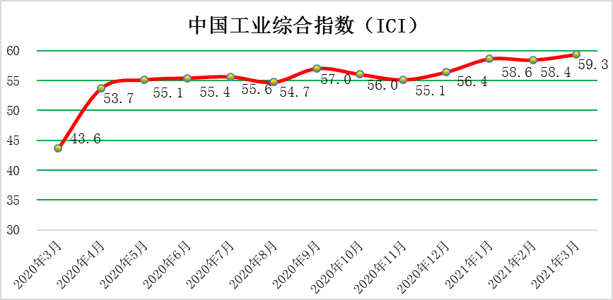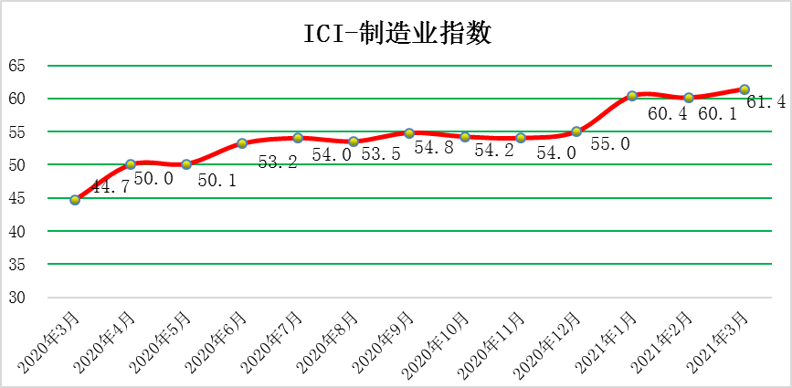 2021年(nian)3月份,中(zhong)國工(gong)業(ye)綜合指(zhi)(zhi)數(shu)(shu)(shu)(以(yi)(yi)下(xia)簡(jian)稱ICI)為(wei)59.3%,環(huan)(huan)比(bi)上(shang)漲(zhang)(zhang)0.9個百分(fen)(fen)(fen)點,春節(jie)效(xiao)應影響(xiang)消除,增速短期加(jia)快,同時(shi)自(zi)去年(nian)4月份以(yi)(yi)來(lai)連續(xu)(xu)位(wei)(wei)于榮(rong)枯(ku)線(xian)以(yi)(yi)上(shang),表明(ming)中(zhong)國工(gong)業(ye)經濟總(zong)體持(chi)續(xu)(xu)恢(hui)復。生(sheng)產狀況(kuang)指(zhi)(zhi)數(shu)(shu)(shu)為(wei)66.3%,環(huan)(huan)比(bi)下(xia)降(jiang)0.4個百分(fen)(fen)(fen)點,稍有回(hui)(hui)落(luo)但繼續(xu)(xu)保(bao)持(chi)高(gao)(gao)位(wei)(wei),企(qi)業(ye)生(sheng)產活動積極平穩進行。效(xiao)益狀況(kuang)指(zhi)(zhi)數(shu)(shu)(shu)為(wei)52.6%,環(huan)(huan)比(bi)上(shang)漲(zhang)(zhang)0.1個百分(fen)(fen)(fen)點,小幅(fu)回(hui)(hui)升。經營(ying)環(huan)(huan)境指(zhi)(zhi)數(shu)(shu)(shu)為(wei)53.9 %,環(huan)(huan)比(bi)回(hui)(hui)落(luo)0.6個百分(fen)(fen)(fen)點,連續(xu)(xu)位(wei)(wei)于榮(rong)枯(ku)線(xian)之上(shang),反映了(le)市場經營(ying)環(huan)(huan)境持(chi)續(xu)(xu)改善(shan)。融(rong)資(zi)難(nan)易(yi)指(zhi)(zhi)數(shu)(shu)(shu)為(wei)48.8%,環(huan)(huan)比(bi)上(shang)漲(zhang)(zhang)1.6個百分(fen)(fen)(fen)點,持(chi)續(xu)(xu)位(wei)(wei)于榮(rong)枯(ku)線(xian)下(xia)方,且該指(zhi)(zhi)數(shu)(shu)(shu)仍低于50%的(de)(de)均衡線(xian),表明(ming)當前企(qi)業(ye)融(rong)資(zi)難(nan)融(rong)資(zi)貴的(de)(de)問題持(chi)續(xu)(xu)存在,針對此(ci)難(nan)題還需更有效(xiao)的(de)(de)貨幣、財政(zheng)(zheng)政(zheng)(zheng)策等。預期發(fa)展指(zhi)(zhi)數(shu)(shu)(shu)為(wei)62.4 %,環(huan)(huan)比(bi)上(shang)漲(zhang)(zhang)2.8個百分(fen)(fen)(fen)點,大幅(fu)上(shang)漲(zhang)(zhang)且該指(zhi)(zhi)數(shu)(shu)(shu)依舊長(chang)期保(bao)持(chi)高(gao)(gao)位(wei)(wei)優(you)勢。ICI制(zhi)造業(ye)指(zhi)(zhi)數(shu)(shu)(shu)為(wei)61.4%,環(huan)(huan)比(bi)上(shang)漲(zhang)(zhang)1.3個百分(fen)(fen)(fen)點,繼續(xu)(xu)處于高(gao)(gao)位(wei)(wei),自(zi)去年(nian)4月份以(yi)(yi)來(lai)連續(xu)(xu)位(wei)(wei)于榮(rong)枯(ku)線(xian)以(yi)(yi)上(shang),表明(ming)制(zhi)造業(ye)總(zong)體持(chi)續(xu)(xu)回(hui)(hui)暖。