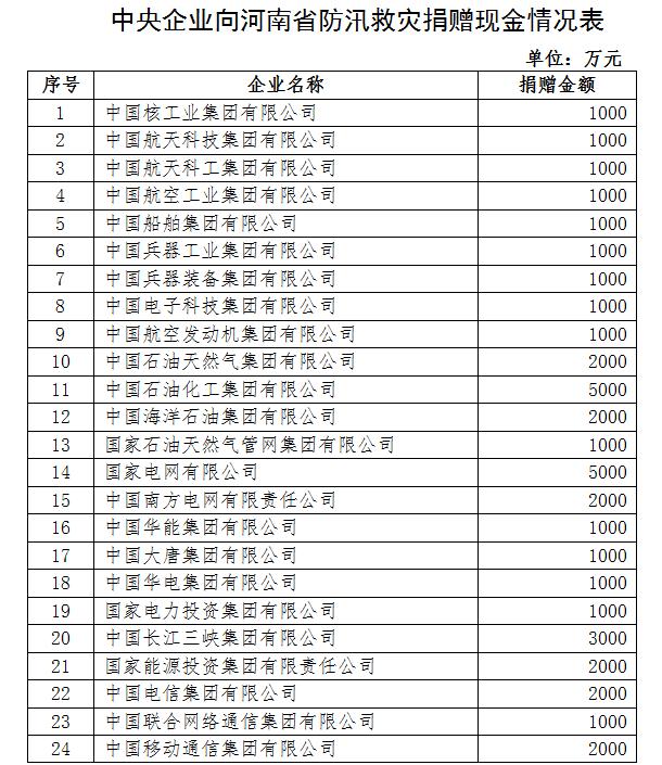 國資委和中央企業(ye)堅決貫(guan)徹落(luo)實(shi)(shi)習(xi)近平總書記(ji)關于防汛(xun)救災的重(zhong)要(yao)指示(shi)精(jing)神,落(luo)實(shi)(shi)黨中央、國務院(yuan)決策部(bu)署,全力支援(yuan)河(he)南(nan)省(sheng)做好(hao)汛(xun)災搶險救援(yuan),進(jin)一步(bu)加(jia)大捐贈力度,截至7月22日19點,89家中央企業(ye)累計向河(he)南(nan)省(sheng)捐贈現(xian)金達(da)10.44億元。