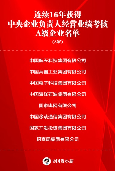 根據《中央企(qi)業(ye)負責人(ren)經(jing)營業(ye)績(ji)考核辦法(fa)》,2019年度中央企(qi)業(ye)負責人(ren)經(jing)營業(ye)績(ji)考核結果已經(jing)國資委黨委會(hui)議審(shen)議通過(guo),現(xian)將A級企(qi)業(ye)名(ming)單(dan)通報如下:
