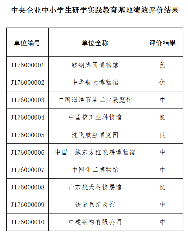 按照《教(jiao)育部辦公廳關于做(zuo)好2019年度中(zhong)央專項彩票公益金支(zhi)持未成(cheng)年人(ren)校外教(jiao)育項目支(zhi)出績(ji)效評價工作(zuo)的(de)通知》(教(jiao)基廳函(han)〔2020〕12號)要求,我們對鞍(an)鋼集團博物館等10家中(zhong)央企(qi)業(ye)中(zhong)小學生研學實踐教(jiao)育基地開展(zhan)了績(ji)效評價工作(zuo),現(xian)將(jiang)結果予以公示。