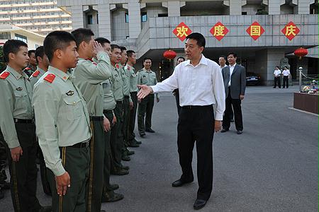2012年(nian)10月1日上(shang)午,國資委(wei)主任、黨委(wei)書記王勇來到(dao)機關(guan)值班室(shi)、武(wu)警駐(zhu)地(di)、保衛處(chu)、食(shi)堂,看望并慰問(wen)堅守在工作崗位上(shang)的值班人員、武(wu)警戰士(shi)和(he)后勤保障人員,向他(ta)們致以節(jie)日的問(wen)候!