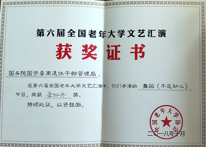 由(you)剛剛參演(yan)(yan)了國資(zi)委(wei)(wei)離退(tui)休(xiu)干(gan)部慶祝改革開放40周年“新時代 新征程”文藝演(yan)(yan)出的(de)舞蹈《不忘初(chu)心》的(de)全(quan)體演(yan)(yan)職人員組成國資(zi)委(wei)(wei)離退(tui)休(xiu)干(gan)部代表隊,再踏(ta)征程,輾轉數千公里參加(jia)了本次匯演(yan)(yan),并在眾多的(de)參演(yan)(yan)藝術團隊中(zhong),經過(guo)多輪選拔(ba),技壓群雄、脫穎(ying)而出,最終奪得了一等獎--金牡丹獎的(de)好成績。