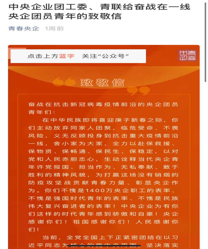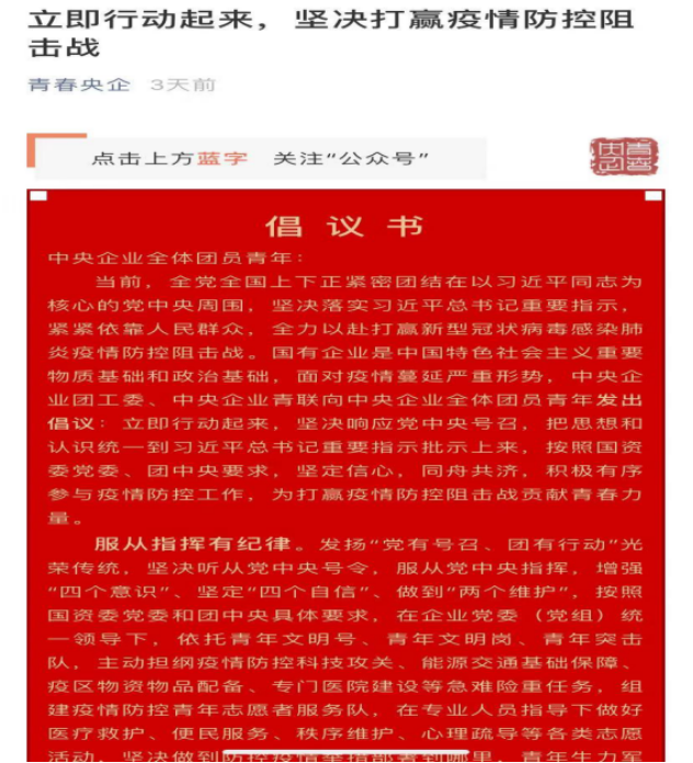 按照國(guo)資(zi)委(wei)黨(dang)委(wei)部署,1月(yue)29日(ri),中央(yang)企業(ye)(ye)(ye)團(tuan)工委(wei)、中央(yang)企業(ye)(ye)(ye)青(qing)聯發出《致中央(yang)企業(ye)(ye)(ye)全(quan)體團(tuan)員青(qing)年倡議(yi)書(shu)》,“堅(jian)定信心,同舟共濟,積(ji)極有序(xu)參與(yu)疫情防控(kong)工作,為打贏疫情防控(kong)阻擊戰貢(gong)獻(xian)青(qing)春力量”,吹響央(yang)企青(qing)年戰“疫”攻堅(jian)號角。