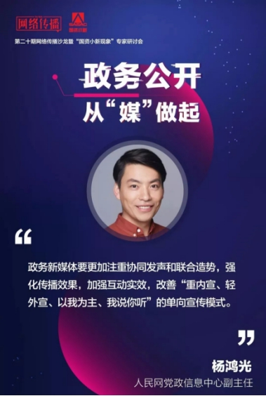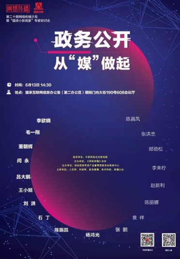 6月13日,由中國(guo)網(wang)絡(luo)空間研(yan)究院指導、《網(wang)絡(luo)傳(chuan)播》雜志主辦的第二十期網(wang)絡(luo)傳(chuan)播沙龍(long)暨“國(guo)資小(xiao)新(xin)(xin)現(xian)象”專家(jia)研(yan)討(tao)(tao)會在(zai)北京市(shi)東城(cheng)區朝陽門內大街190號舉(ju)行,主題為“政(zheng)務(wu)(wu)公開,從(cong)‘媒(mei)(mei)’做起(qi)”。政(zheng)企媒(mei)(mei)學13位業界(jie)大咖和知名專家(jia),聚焦“國(guo)資小(xiao)新(xin)(xin)現(xian)象”,以“國(guo)資小(xiao)新(xin)(xin)”等為研(yan)究對象,進(jin)行了(le)深入研(yan)討(tao)(tao)交流,總結政(zheng)務(wu)(wu)新(xin)(xin)媒(mei)(mei)體(ti)運行發展規律,共同(tong)探(tan)討(tao)(tao)政(zheng)務(wu)(wu)新(xin)(xin)媒(mei)(mei)體(ti)如何進(jin)一步推動政(zheng)務(wu)(wu)公開、提升(sheng)政(zheng)務(wu)(wu)服務(wu)(wu)能力,走好網(wang)上(shang)群(qun)眾(zhong)路線。