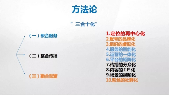 我們把國資小新的運營方法論歸納為“三合十化”。“三合”是聚合服務、整合傳播、融合運營,分別對應政務新媒體的服務、傳播、互動三大功能。具體可以分解為“十化”: