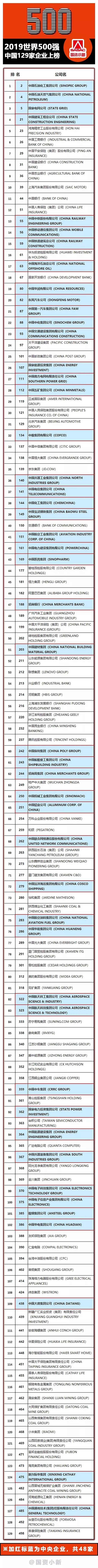 2019年,世界500強中國(guo)(guo)(guo)企業上榜數量129家,其中,國(guo)(guo)(guo)務院國(guo)(guo)(guo)資委監(jian)管的中央企業仍(reng)為(wei)48家。2018年上榜的中國(guo)(guo)(guo)中車股(gu)份有限(xian)公司,2019年體現(xian)為(wei)中國(guo)(guo)(guo)中車集團(tuan)有限(xian)公司;2019年,中國(guo)(guo)(guo)通用技術(集團(tuan))控股(gu)有限(xian)責任公司新(xin)上榜。