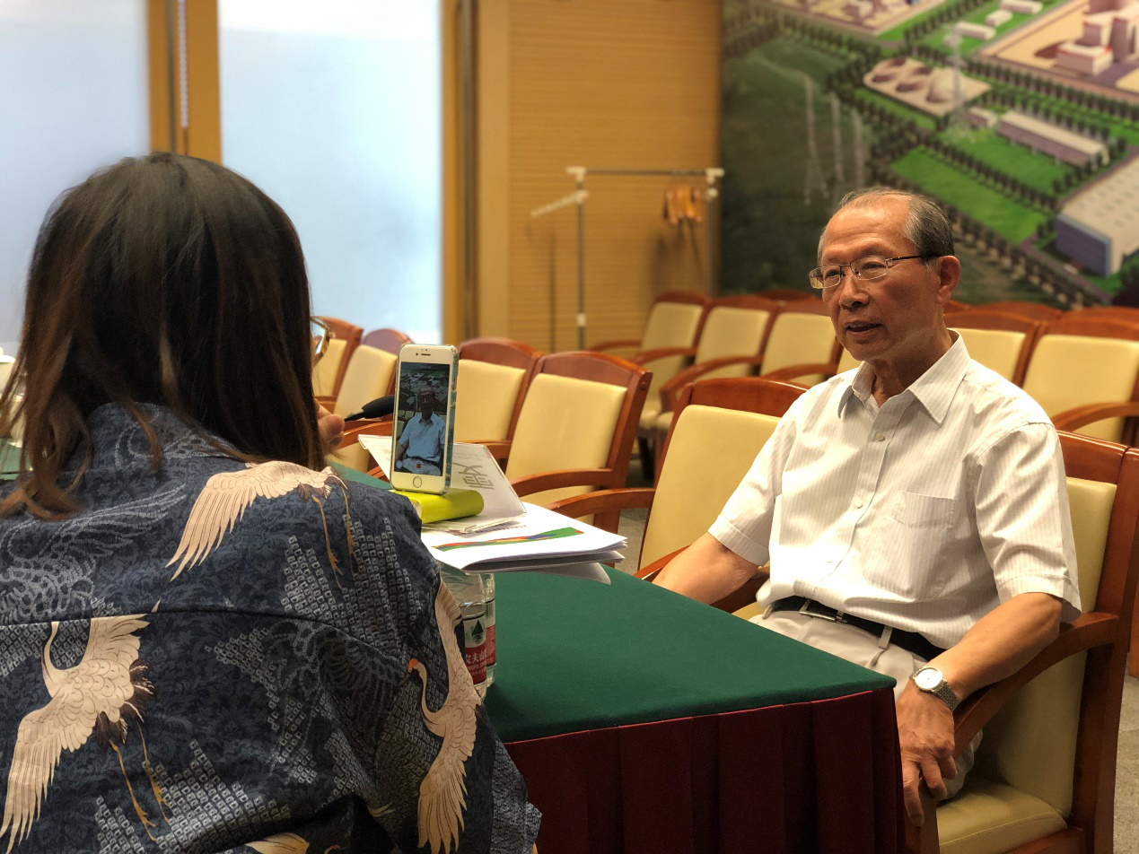 圖為85歲高齡的秦山核電原副總設計師繆鴻興接受采訪。(國務院國資委網站 張曉哲攝)