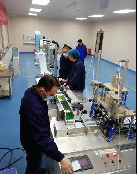中國石油黨員突擊隊技術人員正在調試口罩生產線工藝