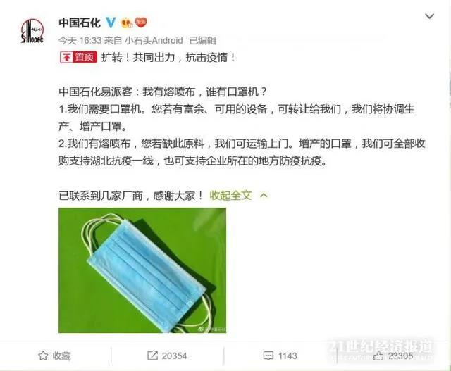 2月(yue)6日(ri)下午16時33分,中(zhong)國(guo)石(shi)化發出“英雄(xiong)帖”《我有熔噴布,誰(shui)有口罩(zhao)機》。2月(yue)7日(ri)中(zhong)午,中(zhong)國(guo)石(shi)化就與合作(zuo)伙伴對(dui)接(jie)完成11條(tiao)口罩(zhao)生產線。3月(yue)3日(ri)起(qi),中(zhong)國(guo)石(shi)化在北(bei)京(jing)50座加油站開始銷(xiao)售的(de)(de)“納(na)通(tong)”牌口罩(zhao),就是與民營企(qi)(qi)業北(bei)京(jing)納(na)通(tong)科技集團(tuan)有限公司合作(zuo)生產的(de)(de)。中(zhong)國(guo)石(shi)化提供(gong)原料的(de)(de)協(xie)作(zuo)企(qi)(qi)業口罩(zhao)日(ri)產量達到105萬只(zhi)。