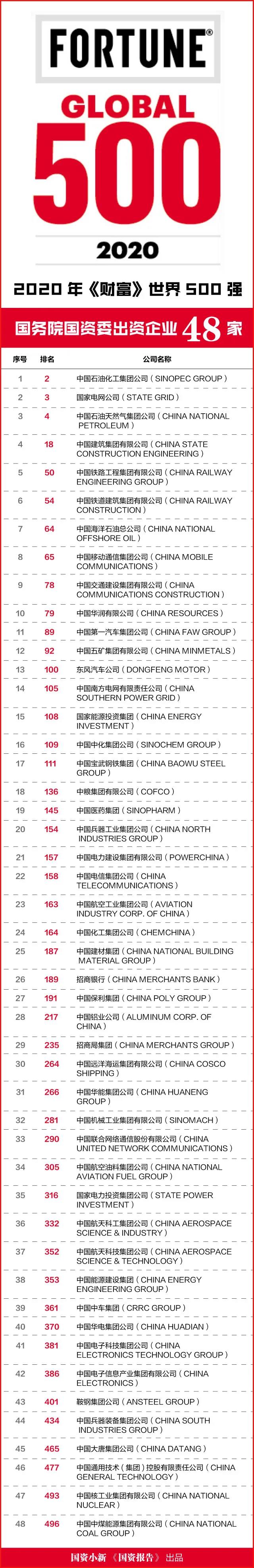 本年度《財(cai)富》世界500強中,國(guo)(guo)務院國(guo)(guo)資委出資的中央企業共有48家入圍(wei),地方國(guo)(guo)資委出資的國(guo)(guo)有企業共有32家入圍(wei)。