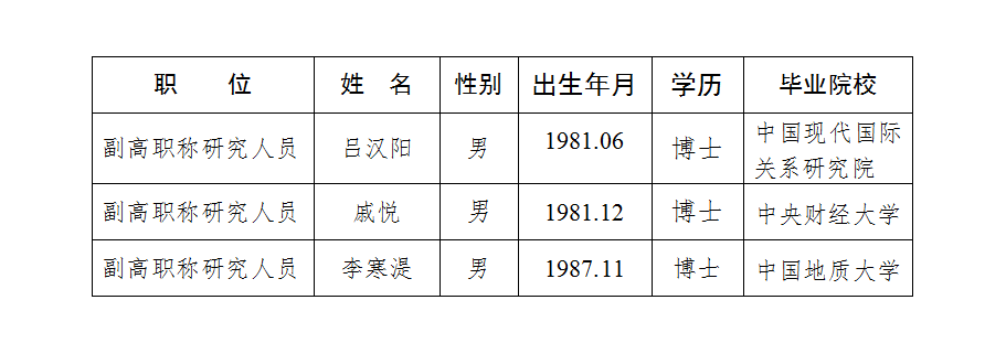 根據《研究(jiu)中心2018年公(gong)開招(zhao)聘專業技(ji)術(shu)人(ren)(ren)員(yuan)實(shi)施方案》,我單位于7月23日至9月17日完成資格審核、筆(bi)試、面試、考察和(he)體(ti)檢等程序。經(jing)研究(jiu)并報委人(ren)(ren)事局同意,擬錄用(yong)以下3人(ren)(ren),現予(yu)公(gong)示。