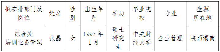 根據事業單位(wei)公(gong)開(kai)(kai)招聘相關規定,按照(zhao)“公(gong)開(kai)(kai)、平等、競爭、擇優”的(de)原則,國務院國資(zi)委干教中心先后完成公(gong)開(kai)(kai)報名、資(zi)格審(shen)查、筆試、面試、體檢、考察(cha)等程序(xu),經研究,擬聘用以下2020年應屆畢業生為我(wo)中心工作人(ren)員,現(xian)公(gong)示如(ru)下: