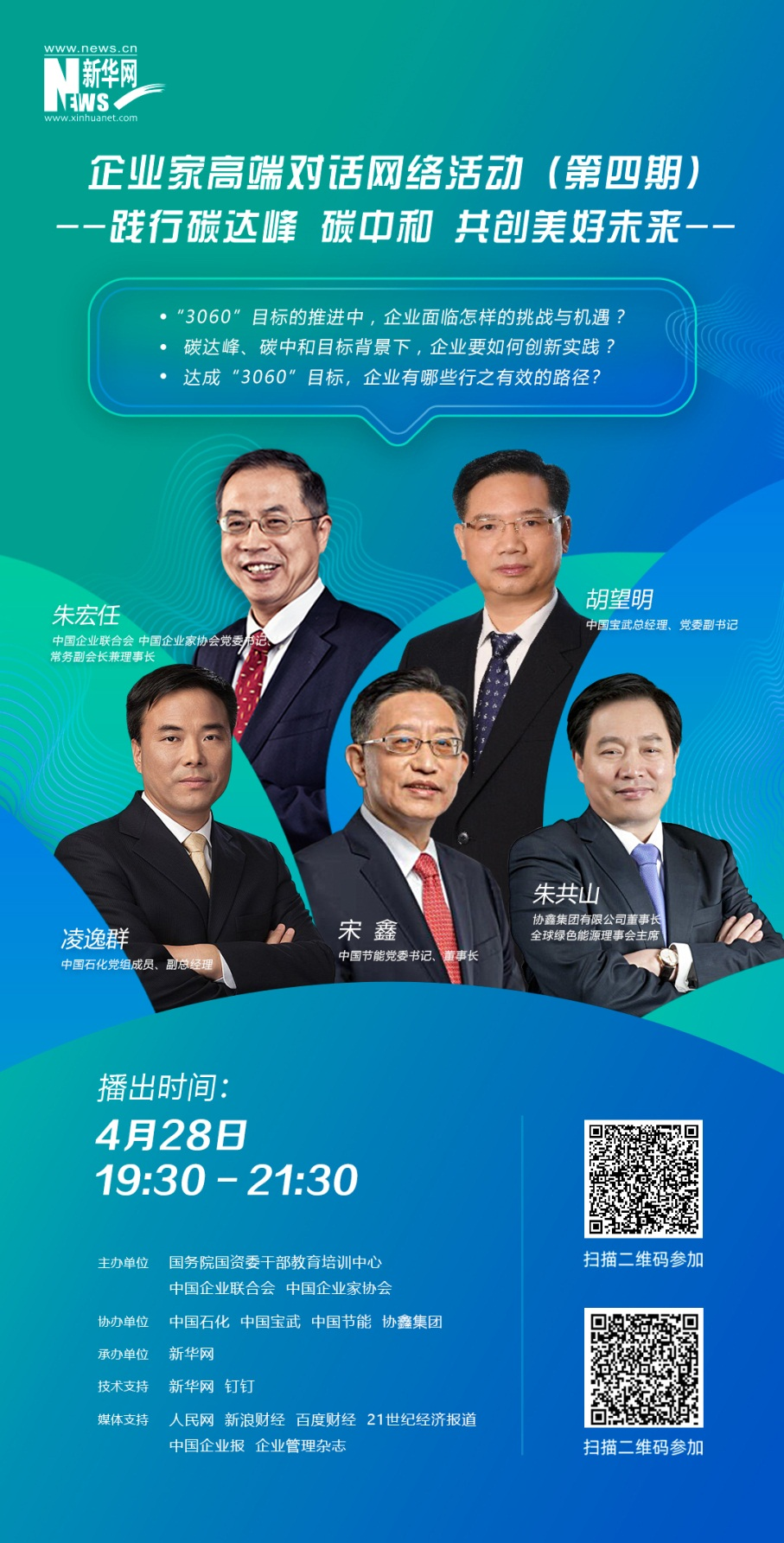 4月28日19:30—21:30,國務院國資委干部教育培訓中心與中國企業聯合會、中國企業家協會將聯合舉辦主題為“踐行碳達峰碳中和 共創美好未來”的第四期企業家高端對話網絡活動。