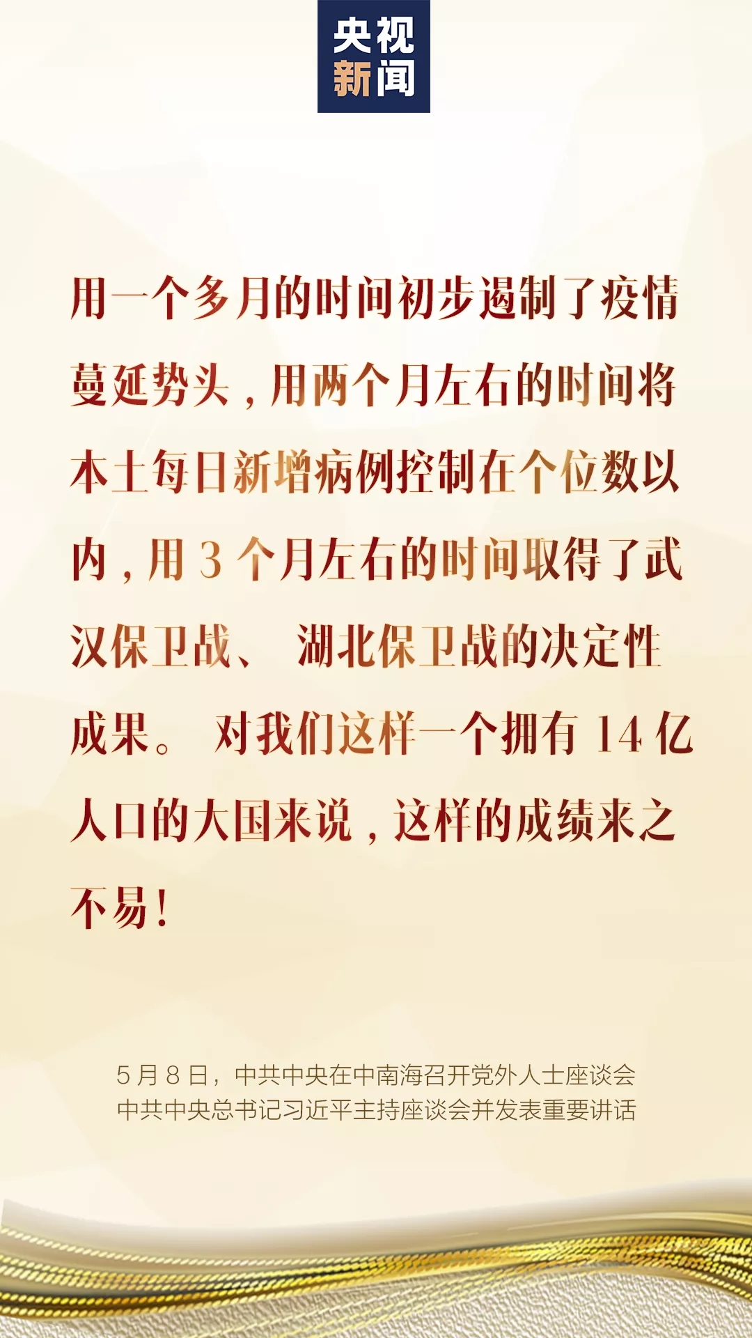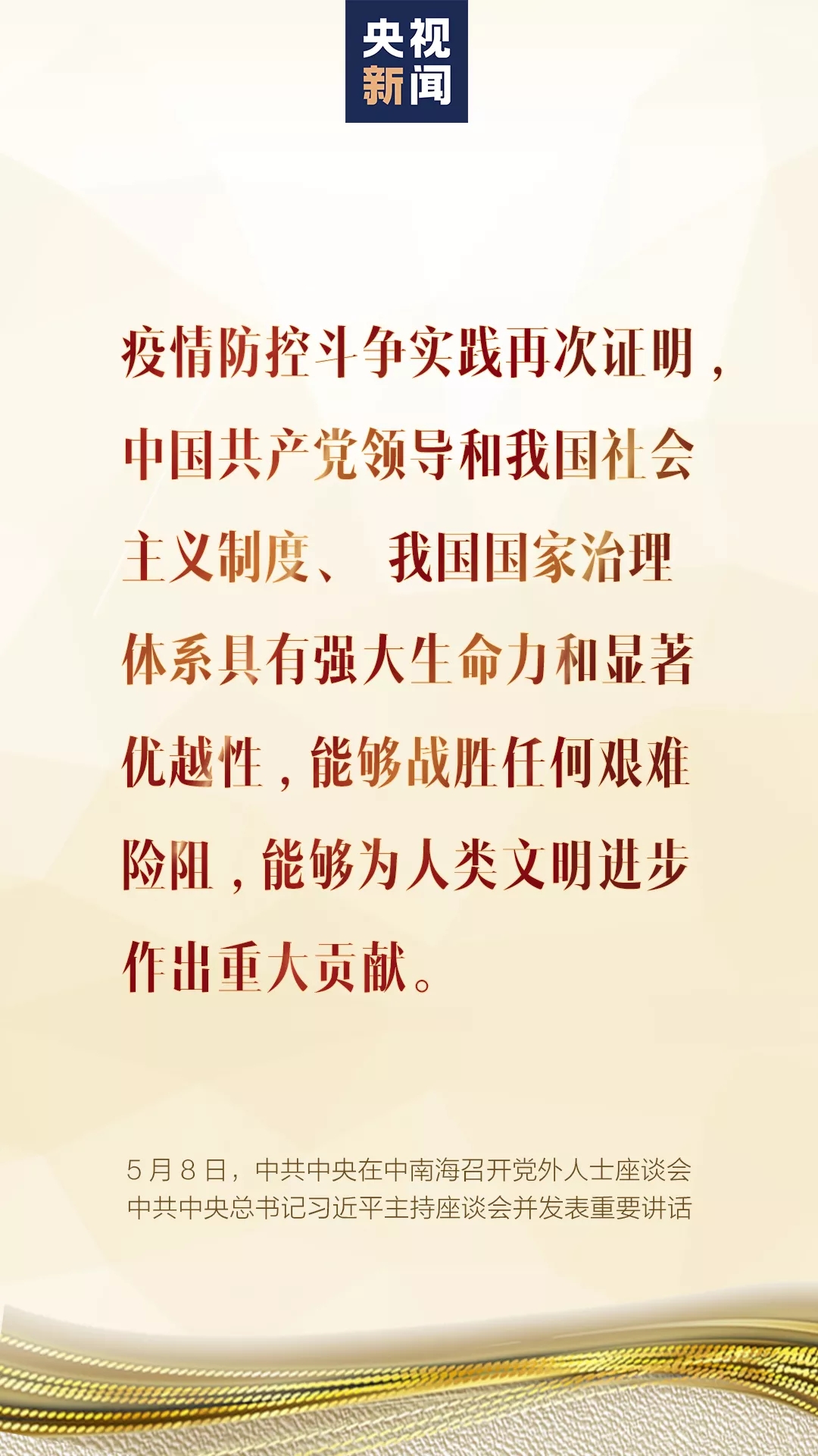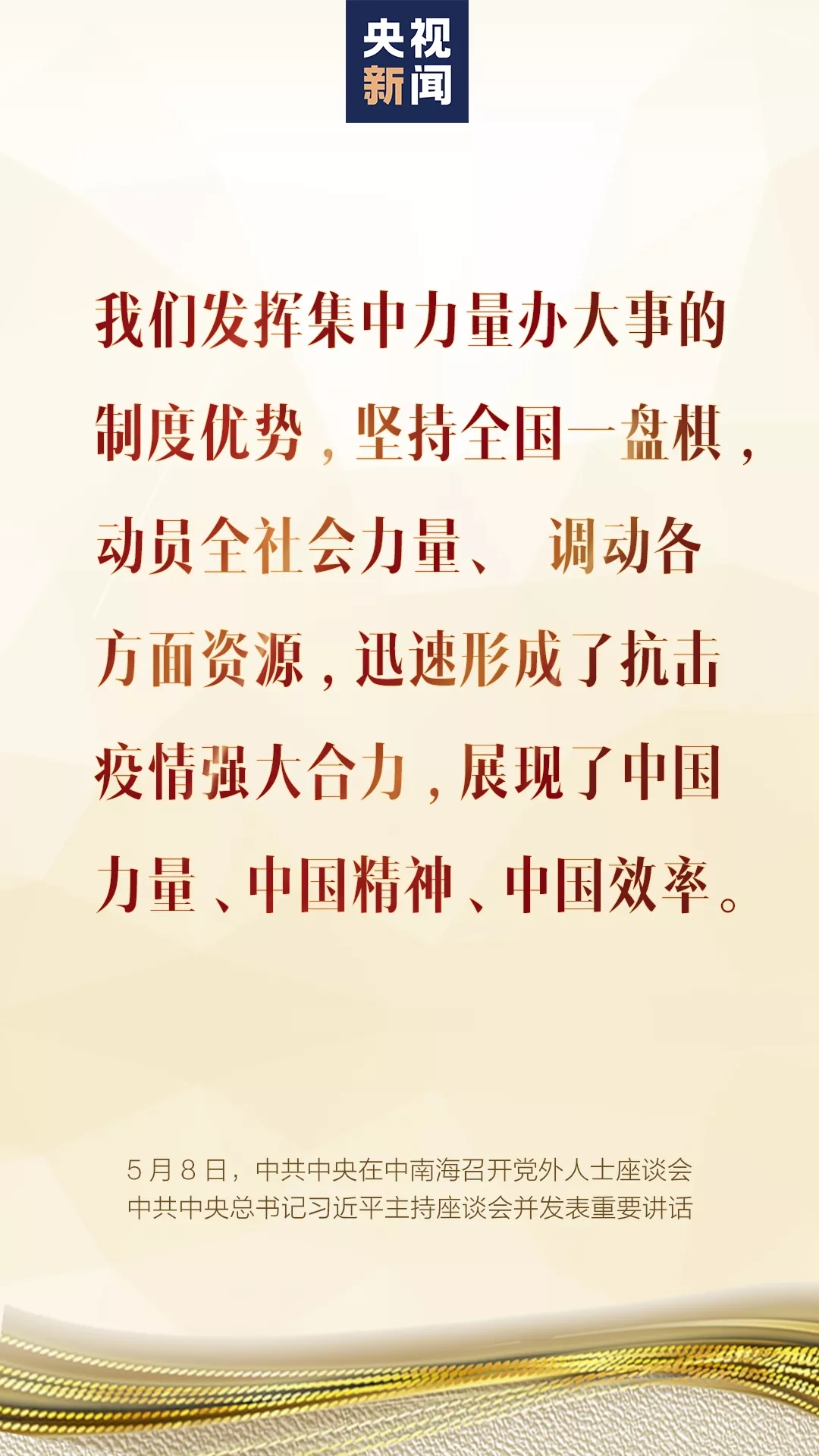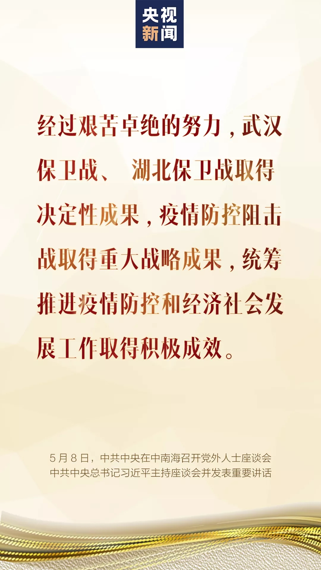 5月8日,中(zhong)(zhong)共中(zhong)(zhong)央(yang)在(zai)中(zhong)(zhong)南(nan)海召(zhao)開黨(dang)外(wai)人士(shi)座(zuo)談會,就(jiu)新冠肺(fei)炎疫情防控(kong)工作聽取各民主黨(dang)派中(zhong)(zhong)央(yang)、全國工商聯和無黨(dang)派人士(shi)代表(biao)的意見和建議。中(zhong)(zhong)共中(zhong)(zhong)央(yang)總書記習近平主持座(zuo)談會并(bing)發表(biao)重要講話。
