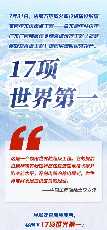 7月31日,由南方電網公司投資(zi)建(jian)(jian)設的國家西電東送重點工程——烏東德電站送電廣(guang)東廣(guang)西特高壓多(duo)端直流(liu)示范工程(簡稱昆(kun)柳龍直流(liu)工程)提前實現(xian)階段性投產。該工程將創造17項世界第一,全(quan)部(bu)建(jian)(jian)成后(hou)每年增送西部(bu)清潔(jie)水電330億度。