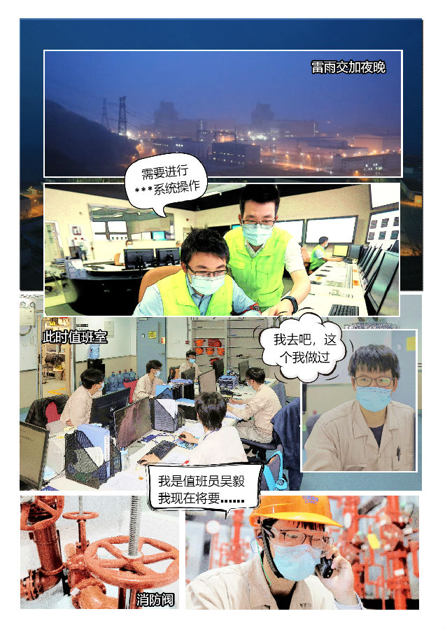 還(huan)記得(de)臺風來臨前(qian)夕,雷雨天氣(qi)導致火(huo)警控制器故(gu)障,使循泵(beng)房區域探頭出現(xian)通(tong)訊故(gu)障,廠用(yong)水泵(beng)坑液位高報(bao),主控判斷廠用(yong)水區域消(xiao)防系統動作或泄漏。值班員吳毅(yi),作為值內實力擔當(dang),主動請纓,在開(kai)車不(bu)便的(de)情況下,冒著暴雨一路小跑到達循泵(beng)房,準(zhun)確(que)定位并操作正在噴水的(de)消(xiao)防閥,迅速解除了故(gu)障。