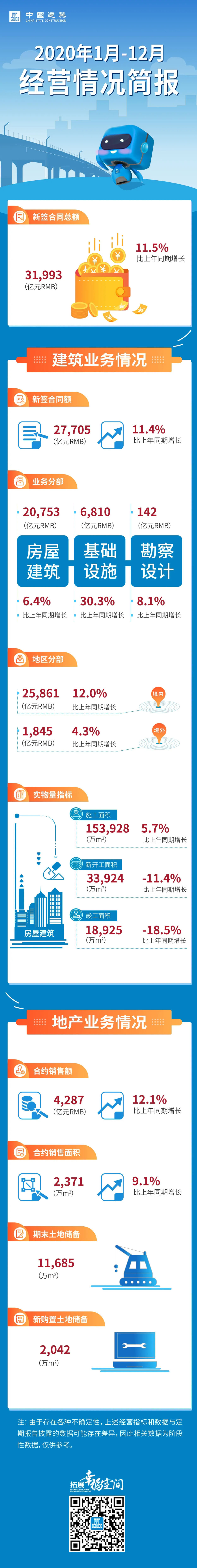 2021年1月7日,中國建筑(601668.SH)公布2020年1-12月經營情況簡報。全年,公司克服疫情不利影響,累計完成新簽合同額31,993億元,再次刷新全球建筑企業訂單記錄,圓滿完成全年目標,整體訂單表現強勁,同比增長11.5%。