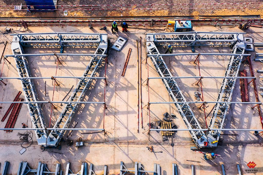 2020年10月(yue)1日,施(shi)工人員將鋼(gang)三角桿件按照模(mo)板位置拼裝(zhuang)(zhuang)焊接(jie)成統一的(de)規格,以(yi)方(fang)便后續安裝(zhuang)(zhuang)。