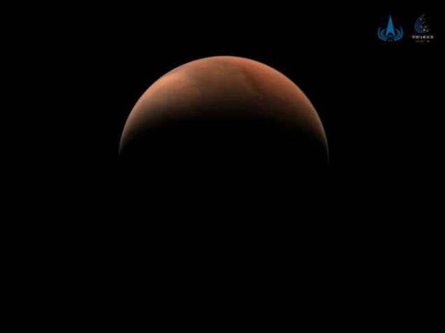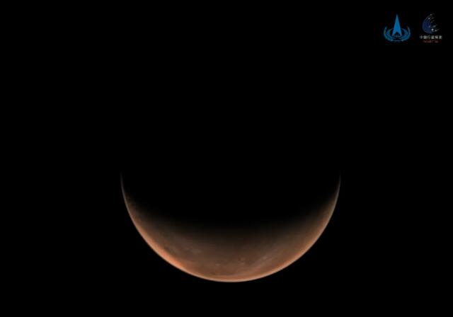 天問(wen)一號探測器(qi)飛行至距(ju)離(li)火(huo)星(xing)1.1萬千米(mi)處(chu),利用中(zhong)分辨率相機拍攝了火(huo)星(xing)全景。此時,由于探測器(qi)處(chu)于火(huo)星(xing)側(ce)(ce)后方上空(以面(mian)向太陽為(wei)前(qian)方),得到兩幅(fu)“側(ce)(ce)身”影像。