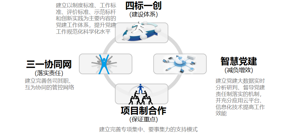 建立以(yi)“四標(biao)(biao)(biao)一(yi)創(chuang)(chuang)”為(wei)(wei)主要(yao)內容的(de)黨(dang)建工作體(ti)系,其中“四標(biao)(biao)(biao)”為(wei)(wei)制度標(biao)(biao)(biao)準、工作標(biao)(biao)(biao)準、評價標(biao)(biao)(biao)準、示范標(biao)(biao)(biao)桿,是黨(dang)建規范化管理制度與要(yao)求(qiu),“一(yi)創(chuang)(chuang)”即創(chuang)(chuang)新(xin)實(shi)踐(jian),為(wei)(wei)自(zi)選動作、特色工作。