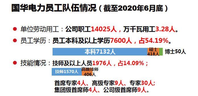 截至(zhi)今(jin)年(nian)6月底(di),國華電力(li)共有職工(gong)14025人(ren)(ren)(ren),近十年(nian)來(lai)公司(si)新增(zeng)裝機2000萬千瓦(wa),員工(gong)總量零增(zeng)長(chang),每萬千瓦(wa)用工(gong)3.28人(ren)(ren)(ren),降(jiang)低了46%;員工(gong)平均年(nian)齡41.9歲,本科及以上學(xue)歷(li)7600人(ren)(ren)(ren),占54.19%,其中,碩士(shi)418人(ren)(ren)(ren),博士(shi)50人(ren)(ren)(ren)。