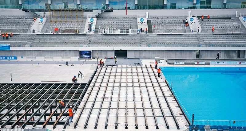 從“水(shui)立方(fang)”到“冰(bing)(bing)立方(fang)”,關鍵是(shi)(shi)要(yao)解(jie)決(jue)“水(shui)冰(bing)(bing)轉(zhuan)換”難(nan)(nan)(nan)題。轉(zhuan)換過程(cheng)(cheng)需經多道工序,主要(yao)是(shi)(shi)把泳池中(zhong)的水(shui)抽干(gan),在底部搭建(jian)可轉(zhuan)換結構(gou)(gou),安裝(zhuang)可拆裝(zhuang)制(zhi)冰(bing)(bing)系(xi)統,將水(shui)面冰(bing)(bing)化,鋪設國際標(biao)準的冰(bing)(bing)壺賽道。其(qi)中(zhong),搭建(jian)轉(zhuan)換結構(gou)(gou)是(shi)(shi)首要(yao)難(nan)(nan)(nan)題,也是(shi)(shi)世界(jie)級難(nan)(nan)(nan)題。轉(zhuan)換結構(gou)(gou)必須輕(qing)便,能(neng)夠快(kuai)拆快(kuai)裝(zhuang),同時還(huan)要(yao)保(bao)證強度(du)。攻關團隊不分(fen)晝夜,選擇(ze)不同的結構(gou)(gou)體系(xi),測試產生的變(bian)形程(cheng)(cheng)度(du),累(lei)計進行了(le)35次試驗,最(zui)終從5種組(zu)合材料中(zhong)選擇(ze)了(le)鋼(gang)結構(gou)(gou)加輕(qing)質混凝土預制(zhi)板(ban)結構(gou)(gou)體系(xi)。每平米加載1噸(dun),轉(zhuan)換結構(gou)(gou)僅產生1.5毫米變(bian)形,遠(yuan)低于控(kong)制(zhi)標(biao)準,有效確保(bao)冰(bing)(bing)面平整度(du)。通過建(jian)筑信息模型(BIM)技術模擬和優(you)化構(gou)(gou)件排(pai)布,為2600根薄壁鋼(gang)和1570塊(kuai)輕(qing)質混凝土預制(zhi)板(ban)編(bian)輯數字身份,從而實現每個構(gou)(gou)件的精準復位,以便在下次轉(zhuan)換過程(cheng)(cheng)中(zhong)快(kuai)速組(zu)裝(zhuang)搭建(jian)。