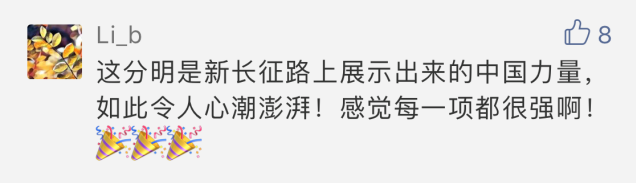 網友@Li_b:這分明是新長征路上(shang)展示出來的中國(guo)力量,如此(ci)令人心潮澎湃!感覺(jue)每(mei)一項都很強啊!