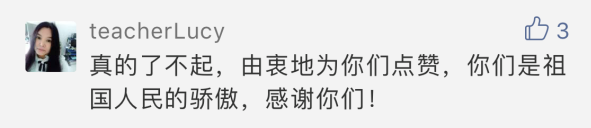 網友(you)@teacherLucy:真的(de)(de)了(le)不起,由(you)衷地為你(ni)們(men)點贊,你(ni)們(men)是(shi)祖國人民的(de)(de)驕傲,感(gan)謝你(ni)們(men)!