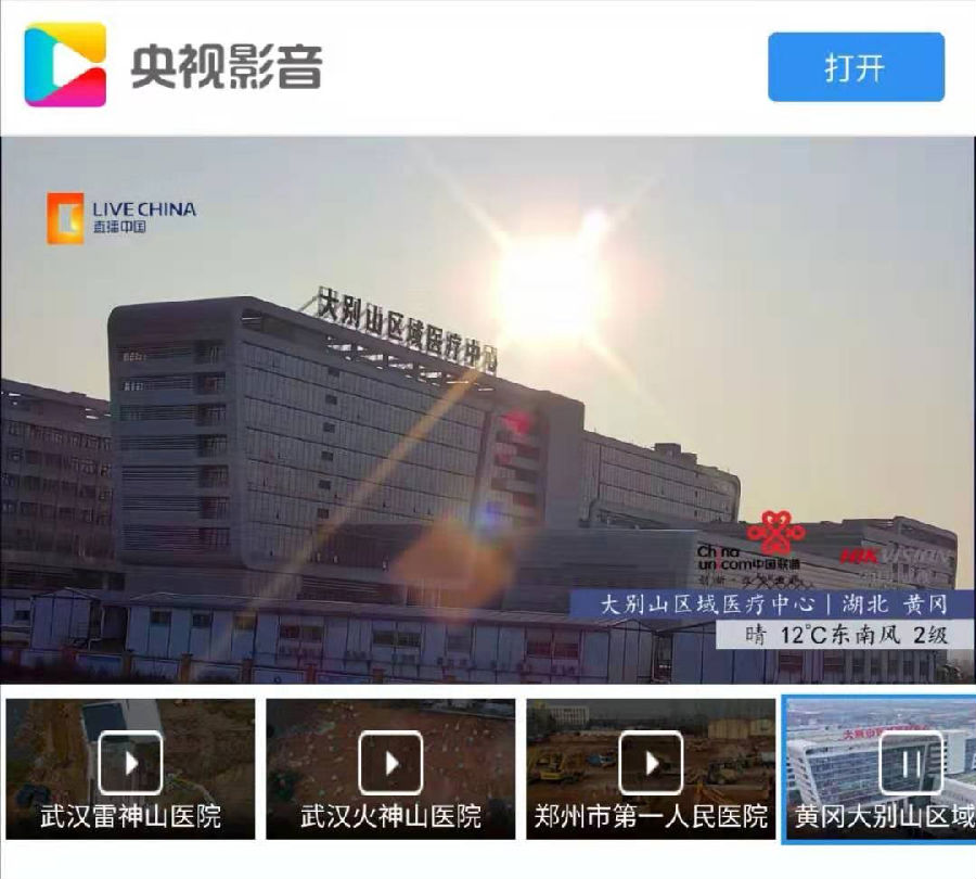 根據1月31日16時(shi)最新(xin)消息,黃岡(gang)大(da)別(bie)(bie)山(shan)醫院的獨(du)家實時(shi)高清直播(bo)也(ye)在(zai)央(yang)視視頻APP上線。至(zhi)此(ci),中國(guo)聯通已上線了“武漢火神山(shan)”“武漢雷神山(shan)”“鄭州(zhou)市第一人(ren)民醫院”“黃岡(gang)大(da)別(bie)(bie)山(shan)”四座醫院直播(bo)。