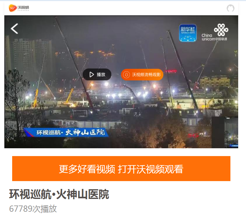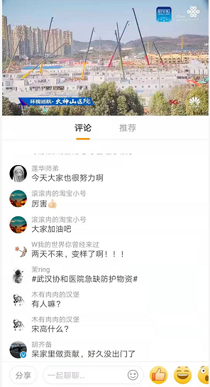 這(zhe)種(zhong)24小時(shi)直播(bo)方式獲得了廣(guang)大(da)網友(you)(you)(you)的(de)認可,有為現場施工(gong)人員點贊的(de),也有為武漢加(jia)油的(de),有網友(you)(you)(you)感慨:“兩天不(bu)來,變(bian)樣了啊!”聯通(tong)5G為這(zhe)些關(guan)心、關(guan)注武漢疫情的(de)網友(you)(you)(you)提供了“云監工(gong)”平臺,在非常時(shi)期,足不(bu)出戶就能隨時(shi)環視(shi)建(jian)筑現場并(bing)參與熱評。