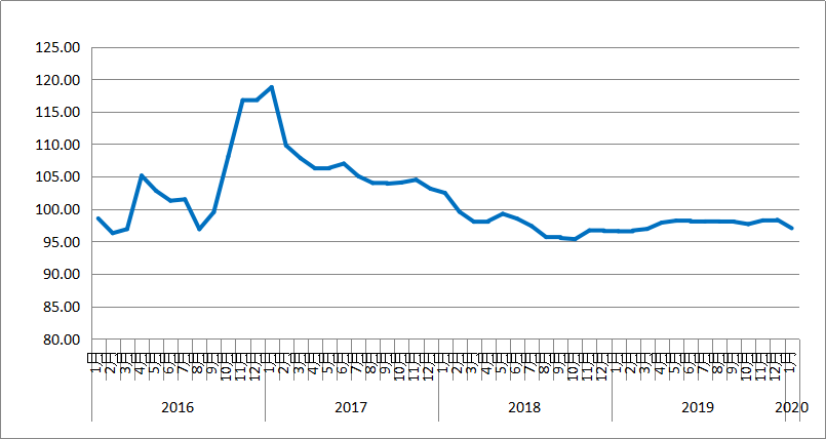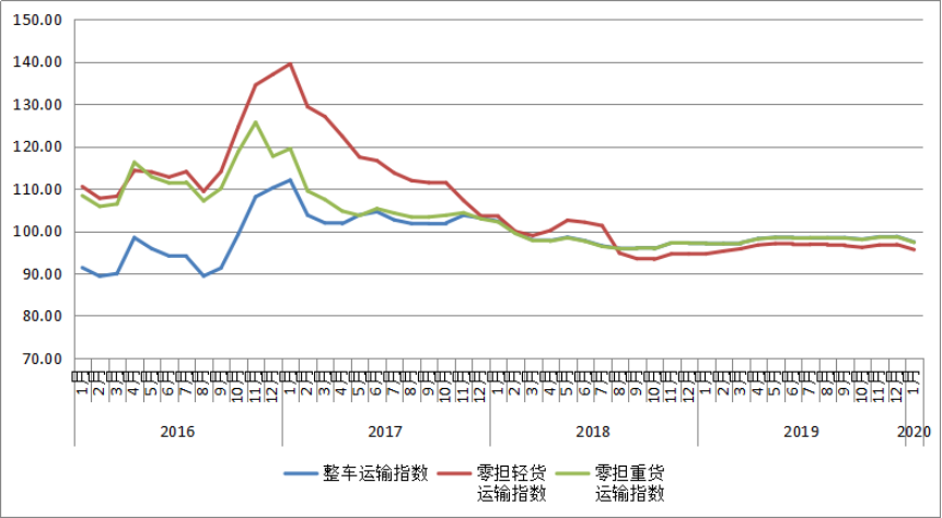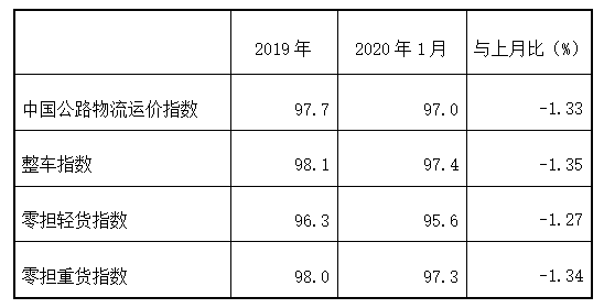2020年(nian)1月份(fen),由中(zhong)國(guo)物(wu)流(liu)(liu)與采(cai)購聯(lian)合(he)會和林安物(wu)流(liu)(liu)集團(tuan)聯(lian)合(he)調查的中(zhong)國(guo)公路物(wu)流(liu)(liu)運價指數(shu)為97點,比上月回(hui)落1.33%,比去年(nian)同(tong)期增長0.5%。月內各周指數(shu)整體呈回(hui)落趨勢,其(qi)中(zhong)第一、三(san)、四周環(huan)比回(hui)落,第二、五周環(huan)比回(hui)升。