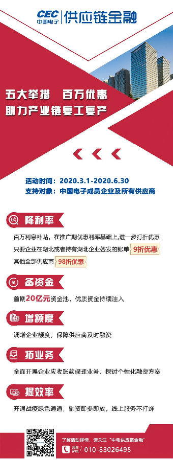 中(zhong)電惠融(rong)通過(guo)降利(li)率(lv)、備資(zi)(zi)金、增額度、拓業務、提效率(lv)五大舉(ju)措,開通戰(zhan)疫綠色通道,為(wei)供(gong)應商減免百(bai)萬利(li)息,高效解決供(gong)應商資(zi)(zi)金難題,在中(zhong)國電子各(ge)企(qi)業有序(xu)復(fu)(fu)工(gong)復(fu)(fu)產的(de)同時,通過(guo)高效的(de)金融(rong)服務助力產業鏈中(zhong)小企(qi)業協同復(fu)(fu)工(gong)復(fu)(fu)產。