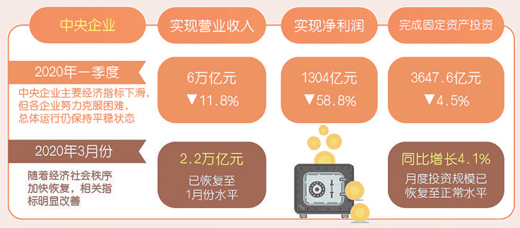第一季度(du),受疫(yi)情影響,中央企業生(sheng)產(chan)經營面臨諸多挑戰(zhan),主要經濟指標出現(xian)下滑:實現(xian)營業收入6萬億(yi)元,同比(bi)下降11.8%,超過八成企業營業收入下滑;實現(xian)凈利潤1304億(yi)元,同比(bi)下降58.8%; 3月份(fen)月度(du)凈利潤比(bi)2月份(fen)明顯回升,但比(bi)上年同期仍(reng)有(you)較大差(cha)距。