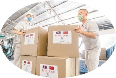4月22日,在老撾首都萬象,中國中鐵員工協助搬運捐贈的醫用口罩。