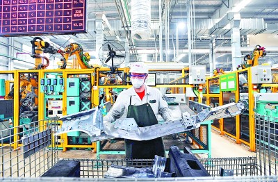 武漢愛機汽車配件有限公司,工人在汽車配件生產線上工作。