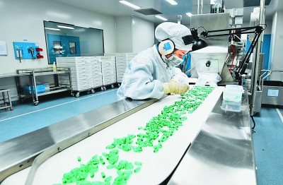 人福普克藥業(武漢)有限公司,工人在后處理工序生產線工作。