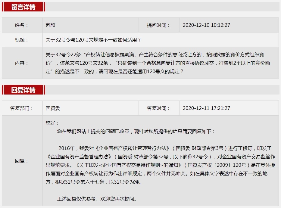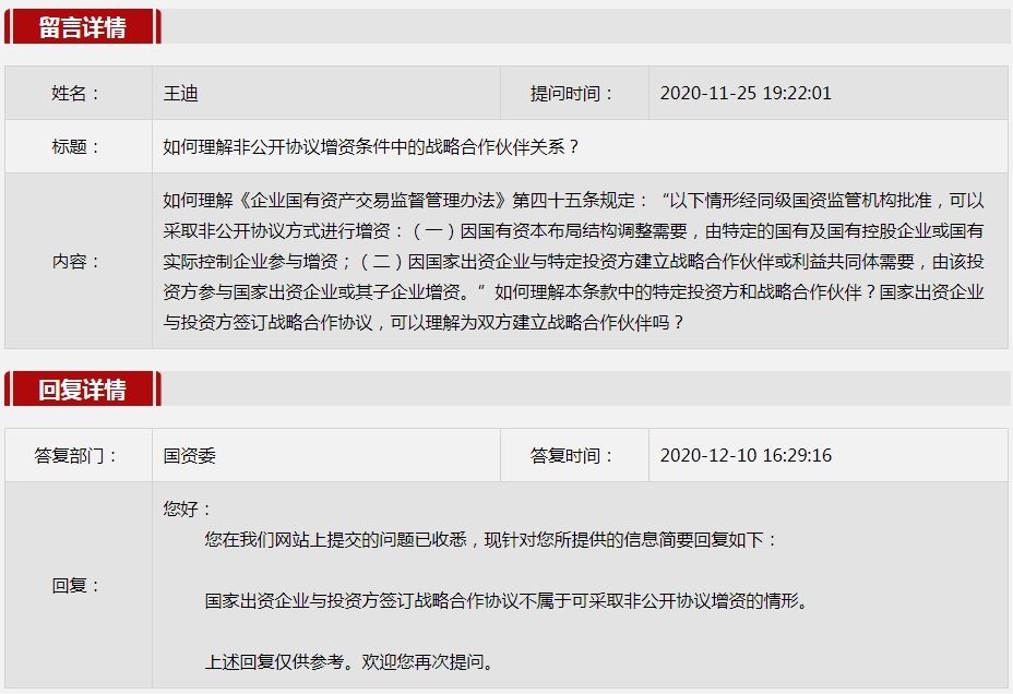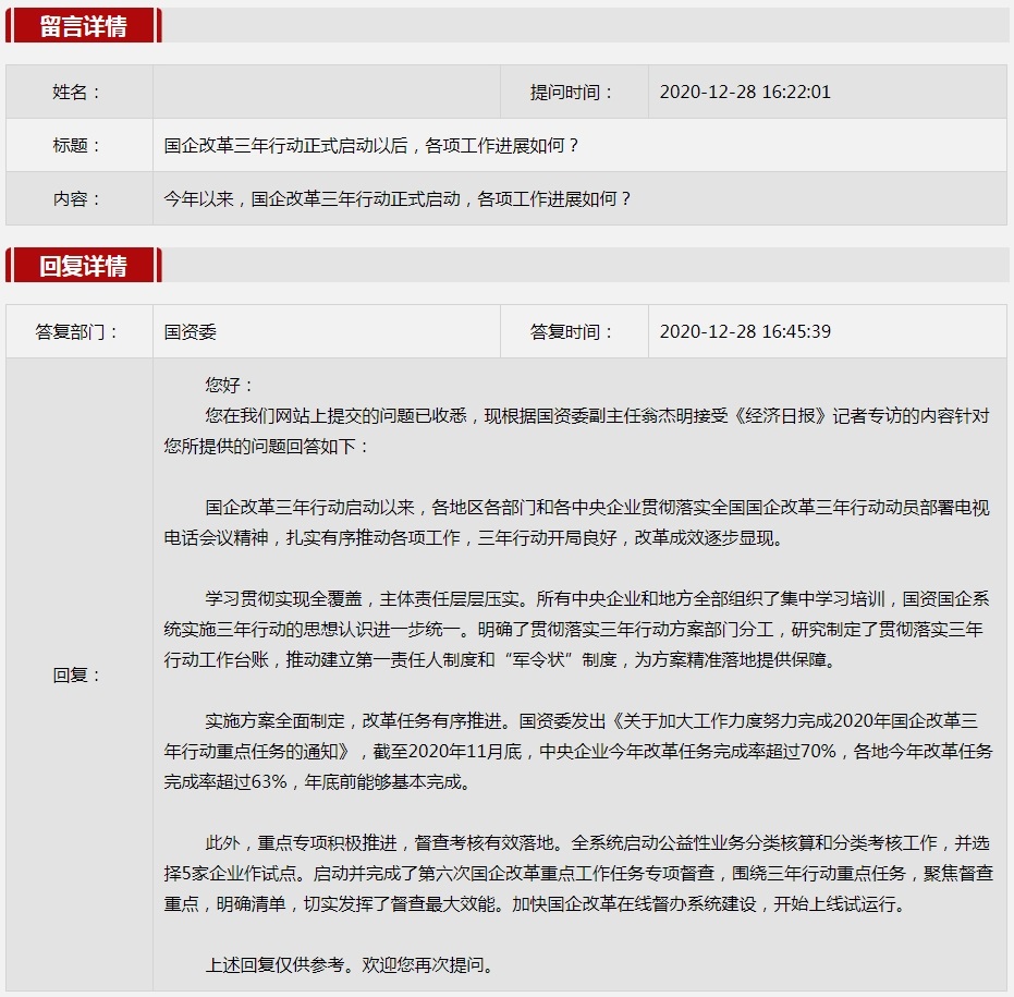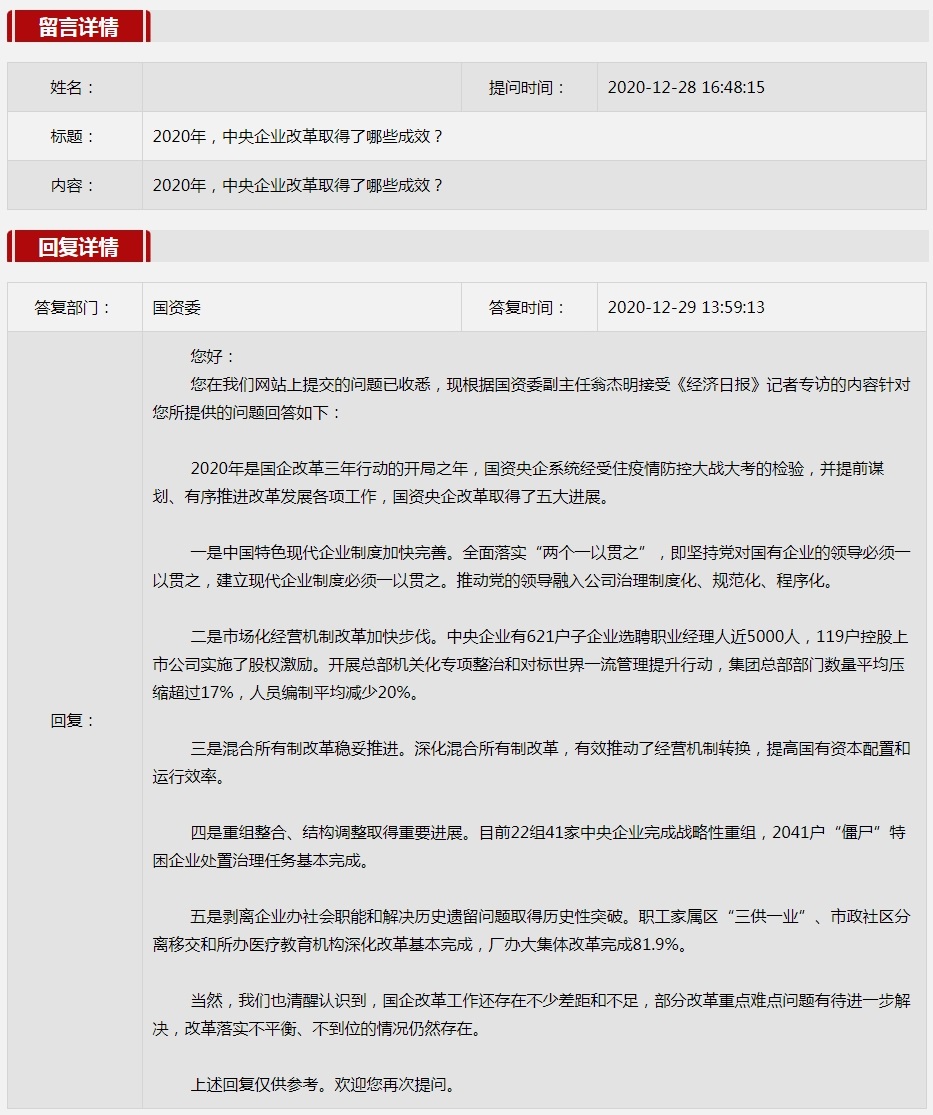 2020年12月(yue)國資委(wei)網站政務咨詢欄目部分網友提出的(de)咨詢,我們(men)初步做出了認真的(de)回應,現選擇五(wu)條關(guan)注(zhu)度高、點擊(ji)量高的(de)問題,再次推(tui)薦分享(xiang)。
