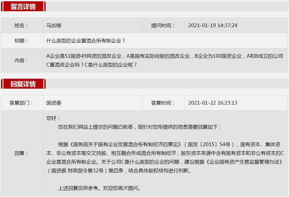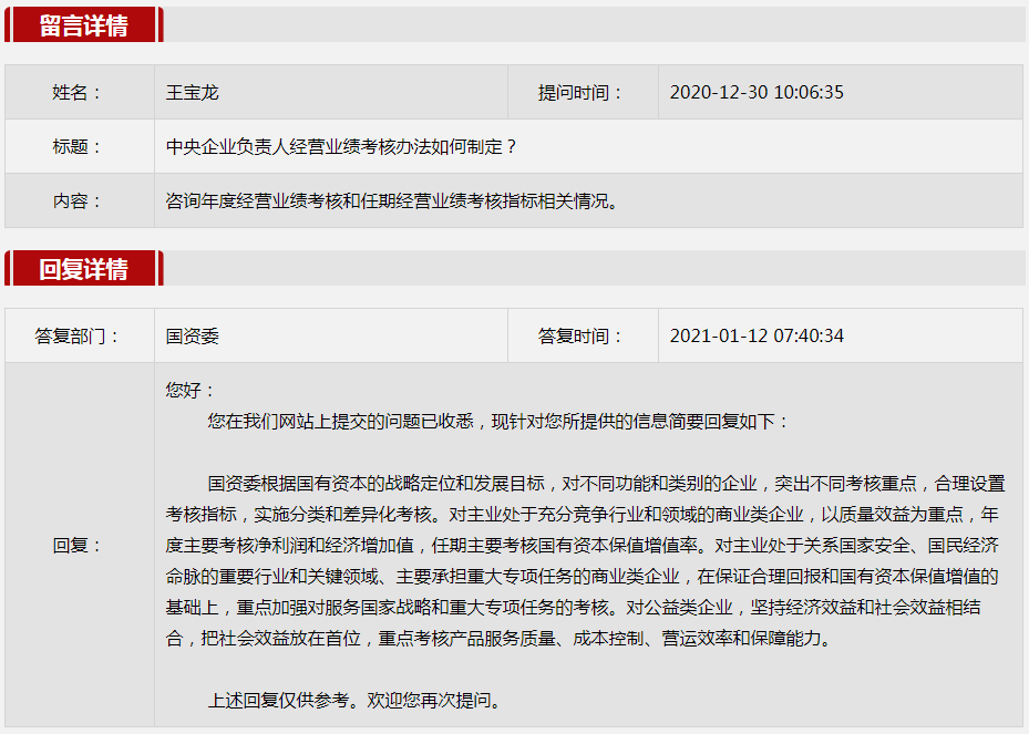 2021年1月國資委網站政(zheng)務咨詢(xun)欄目部(bu)分(fen)網友(you)提出的(de)咨詢(xun),我們初(chu)步做出了認真的(de)回(hui)應(ying),現選擇五條(tiao)關注度高、點擊量(liang)高的(de)問(wen)題,再次推薦分(fen)享(xiang)。