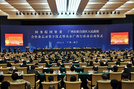 3月27日,國務院國資委與廣西壯族自治區人民政府在南寧舉行合作備忘錄簽字儀式暨“央企廣西行”活動啟動儀式,商定在“十二五”期間深入開展“央企廣西行”系列活動,共同推動中央企業與廣西的戰略合作。自治區黨委書記郭聲琨,自治區主席馬飚會見國務院國資委主任、黨委書記王勇一行。王勇和馬飚出席簽字暨啟動儀式并講話,國資委副主任黃丹華和自治區常務副主席黃道偉代表雙方簽署協議。自治區黨委副書記危朝安等領導,以及國資委副秘書長郭建新出席相關活動。