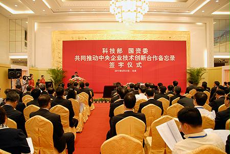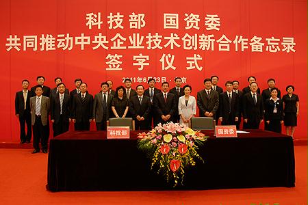 2011年(nian)6月(yue)23日(ri),科(ke)技部(bu)(bu)、國資委在北京會議中(zhong)心(xin)舉行了共(gong)同(tong)推(tui)動中(zhong)央(yang)企業技術創新合作備忘錄簽字儀式(shi)。全(quan)國政協副主席(xi)、科(ke)技部(bu)(bu)部(bu)(bu)長(chang)萬鋼(gang)和(he)(he)國資委主任王勇(yong)分別在簽字儀式(shi)上致辭,科(ke)技部(bu)(bu)副部(bu)(bu)長(chang)陳(chen)小婭和(he)(he)國資委副主任黃丹華(hua)代(dai)表兩部(bu)(bu)門簽字。科(ke)技部(bu)(bu)、國資委相關司局(ju)負(fu)責同(tong)志(zhi)出席(xi)見證簽字儀式(shi)。參加簽字儀式(shi)的還有部(bu)(bu)分中(zhong)央(yang)企業的主要(yao)負(fu)責同(tong)志(zhi)。
