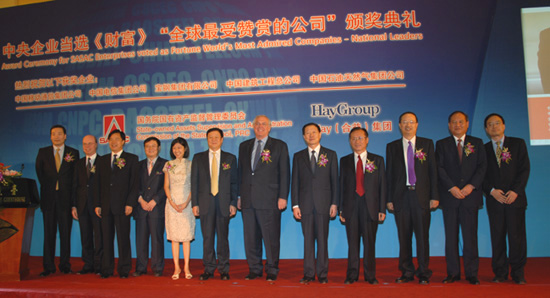 9月12日,國務院國資委與美國合益集團、《財富》雜志在釣魚臺國賓館聯合舉辦了中央企業當選《財富》“全球最受贊賞的公司”頒獎典禮,表彰在第十屆“全球最受贊賞的公司”評選活動中獲得“中國地區最受贊賞公司”稱號的五家中央企業。國務院國資委主任李榮融出席會議,國務院國資委副主任黃淑和作重要講話,合益集團董事會主席克雷斯·馬修斯(Chris Matthews)先生、《財富》亞洲出版總監Ang Khoon Fong女士為企業代表頒獎并講話。