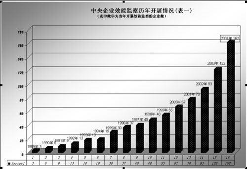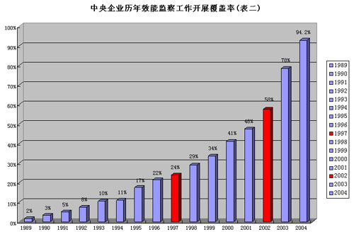 中央企業效能監察工作前后經歷了三個階段:一是1989——1997年,開展效能監察工作的中央企業由3戶發展到40戶,為起步摸索階段;二是1998——2002年,開展效能監察工作的中央企業由40戶發展到93戶,為推廣階段;三是2003——2004年,開展效能監察工作的中央企業由93戶發展到162戶,為普及發展階段。兩年間中央企業開展效能監察工作新增69家,工作普及率提高了46.8%,而且,正在向各類公司制企業延伸。2003年1月至2004年底,中央企業及其所屬二級以上企業效能監察工作共立項23344項,其中:國有獨資企業立項20336項、股份制企業立項2877項、中外合資企業立項53項、境外企業立項78項。可以說,目前中央企業效能監察工作領域覆蓋了各類公司制企業。(附表一、表二)