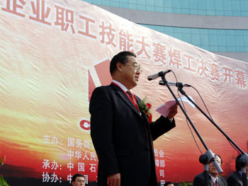 由國務院國資委和勞動保障部聯合主辦、中國石化集團承辦的中央企業職工技能大賽焊工決賽,今天在江蘇油田隆重開幕了。在此,我代表國資委、大賽組委會表示熱烈的祝賀!向參賽的各位選手、領隊、教練員、裁判員表示親切的問候!向前來檢查指導大賽的全國總工會領導,向關心重視大賽的江蘇省、揚州市各級領導,向關心支持大賽的新聞界的朋友,表示衷心的感謝!