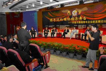 在慶祝香港回歸祖國10周年的喜慶日子,2007年7月19-22日,由中央企業青年聯合會和香港青年聯會主辦的“攜手邁向國際經濟舞臺—內地與香港青年企業家發展論壇”,在北京成功舉行,取得積極成果。國務院國資委副主任王瑞祥,中央人民政府駐香港特區聯絡辦公室副秘書長王志民,香港特區政府民政事務局副秘書長唐智強,香港青年聯會主席姚祖輝出席論壇并致辭。國務院港澳辦交流司副司長謝偉民,全國青聯秘書長安桂武,全國青聯副主席、香港青年聯會首席參事曾智雄出席論壇。由香港企業界、商業界、金融界、律師界等各界青年才俊30余人組成的香港青年聯會交流團,來自70余戶中央企業的80余位中央企業青聯委員、青年企業家,以及中國誠通控股公司青聯和中國印刷集團公司青聯委員共計180余人參加論壇。期間,交流團一行還參加了“相聚國旗下”天安門廣場升旗儀式等活動,拜訪了國務院國資委、國務院港澳辦和全國青聯,在人民大會堂受到全國政協副主席、中央統戰部長劉延東的親切接見。