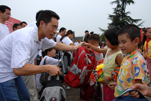 北京有色金屬研究總院:北京有色金屬研究總院團委組織了“有研總院研究生校園愛心行——走進綠園小學”的關愛行動,為孩子們送去了總院全體青年志愿者的愛心——風扇、音響、錄音機以及書籍、玩具等。孩子們在收獲禮物的喜悅中,紛紛在橫幅上抒寫了自己的理想和希望。