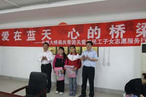 中國鐵路工程總公司:5月4日下午,中國鐵路工程總公司中鐵大橋局集團公司團委舉行了“愛在藍天,心的橋梁——共青團關愛農民工子女志愿服務行動”活動啟動儀式,向農民工子女代表贈送了書包、文具、書籍等學習用品。受捐贈的一位小學生滿懷真情地說:“我們一定要好好學習,讓奔波在外的父母放心,讓建設大橋的叔叔阿姨、哥哥姐姐們放心” 。