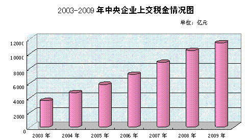 四、上交稅金情況。2009年中央企業實際上交稅金總額11474.8億元(含石油特別收益金680億元),比上年增長10.1%,比2003年增加7911.7億元,六年間年均增加1318.6億元,年均遞增21.5%。在全部上交稅金中,增值稅3782.3億元,占上交稅金總額的33%;企業所得稅2203.7億元,占19.2%;消費稅2071.9億元,占18.1%;營業稅1050.2億元,占9.2%;石油特別收益金680億元,占5.9%。2009年實際上交稅金總額超過百億元的中央企業有23家,比上年增加1家,比2003年增加15家。